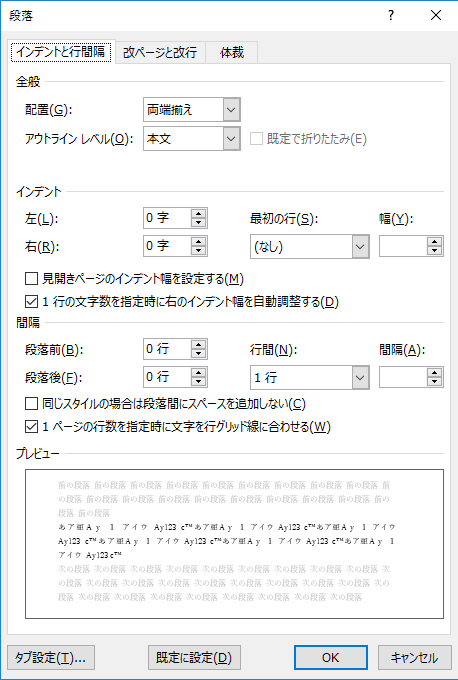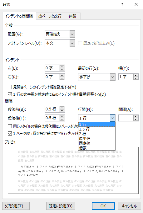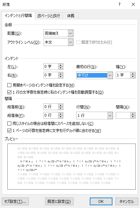 インデントの最初の行で, 字下げ(1文字)を設定すると自動的にその段落は1文字字下げされます.