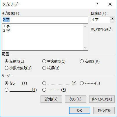 すると, 以下のようなタブとリーダーの設定画面が表示される. 標準のタブ位置は4字と設定されているため, 通常の編集画面でタブキー(左側にTabとあるキー)を押すと4字進むことになります. ここではタブ位置として1字を入力し設定, 2字を入力し設定することで1字, 2字でもタブ位置が使用できるようになっています. また使用しないタブ位置は削除できるので, 必要に応じて使用するタブ位置のみ設定ボタンを押し「当該段落」にタブ位置を保存します.