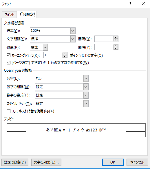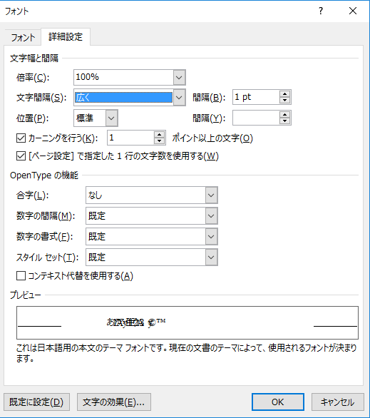 詳細設定タブでは文字間隔等が設定できます. 実際に文字間隔を設定してみよう.